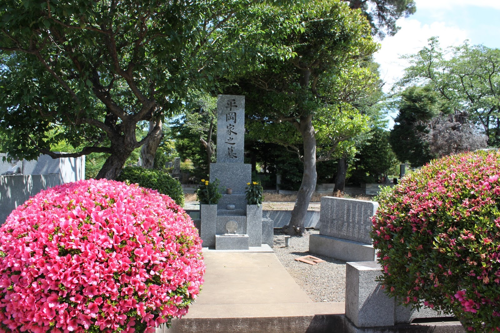 Amazed by what had just happened, Sarah and I made our way into the heart of the cemetery. Because it was quite large (and the map was quite small), we had trouble orienting ourselves toward the row of tombstones we'd been shown. We kept an eye out for distinctive landmarks to help us discern the way. After moving straight ahead for a long while, we turned left and walked parallel to the row in question. It was a still and sunny day, and while I doubted anyone would be keeping an eye on us, the conspiratorial conversation had made me a little apprehensive. We reached the end of the outer row and determined Mishima's grave would be just a row or two farther. So we entered the first row, looking for a tombstone that would match the images I'd found online. I scanned the tombstones intently, focusing on the kanji and the surrounding foliage, before Sarah called me over to join her. I came over and looked, and sure enough...